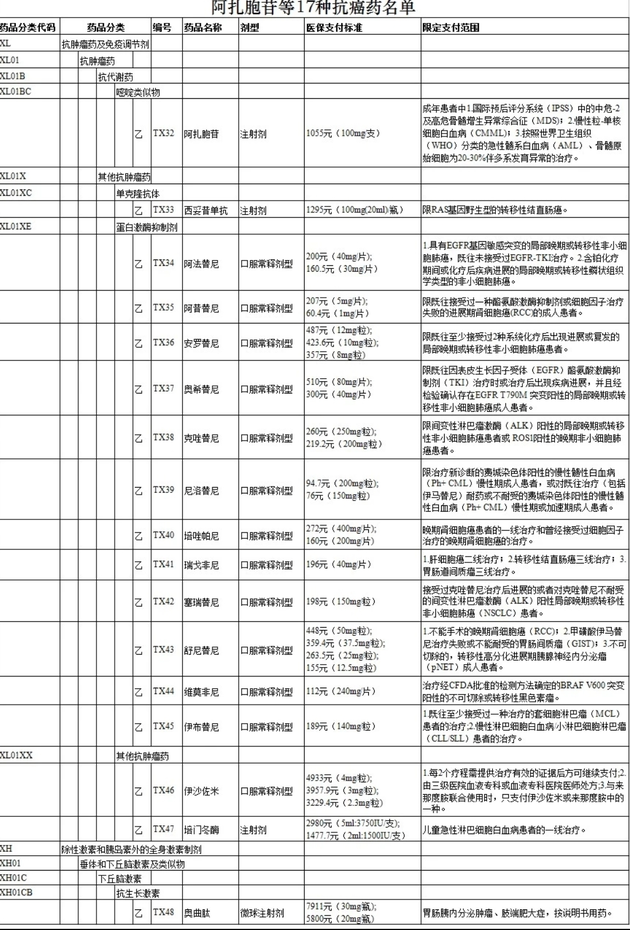 10月10日上午,国家医疗保障局发布《关于将17种抗癌药纳入国家基本医疗保险、工伤保险和生育保险药品目录乙类范围的通知》,阿扎胞苷等17种药品纳入《国家基本医疗保险、工伤保险和生育保险药品目录(2017年版)》乙类范围,并确定了医保支付标准。