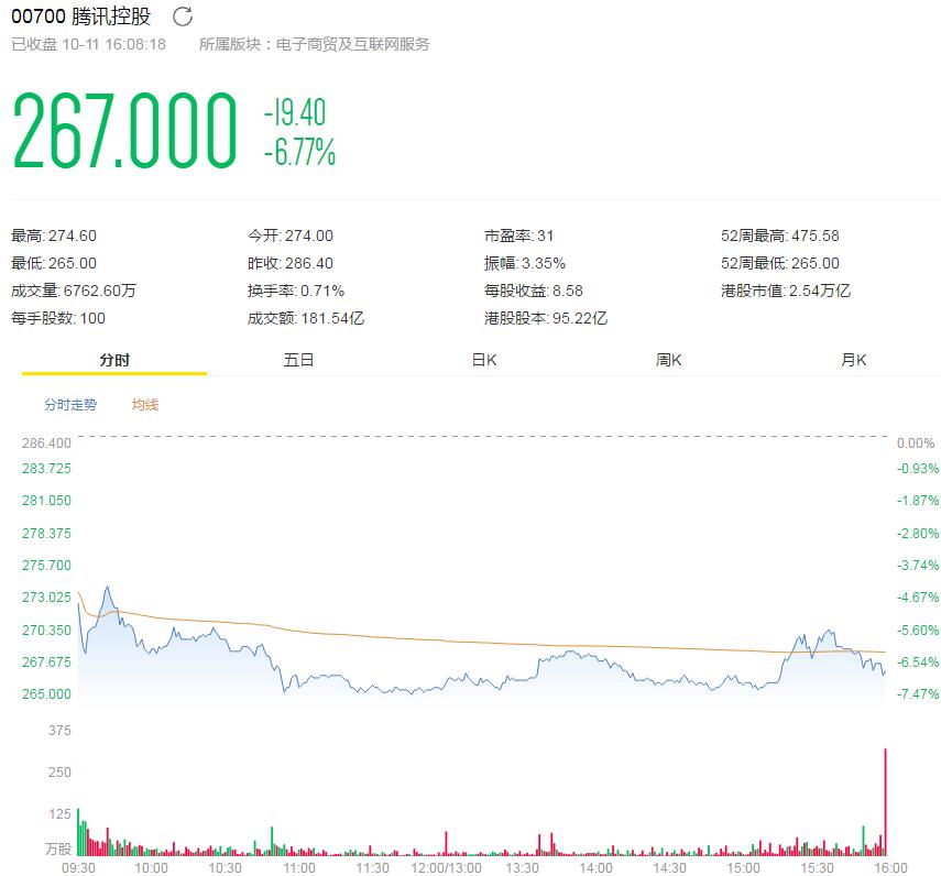 腾讯控股暴跌6.77%,领跌蓝筹,将创7年来最大跌幅。距离腾讯(00700)季绩公布尔日倒数近1个月,大行瑞银及摩根大通率先调低集团季度盈利预测,再削目标价超过10%,累股份连跌9个交易日,创2004年中上市以来最长跌浪。投资界忧虑互联网行业“削价潮”陆续有来,为腾讯后市再添压力。此外,瑞声科技,7.29%;舜宇光学科技跌6.18%。