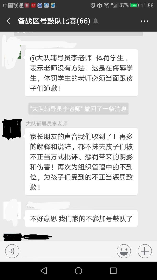 事发后,有家长表示,老师这样侮辱学生,他的孩子将不再参加号鼓队比赛。随后,当事的外聘人员王老师被拉入“备战区号鼓队比赛”微信群,并向家长们诚挚道歉。很快有家长表示,他选择原谅,只是希望老师“学高为师,身正为范”。