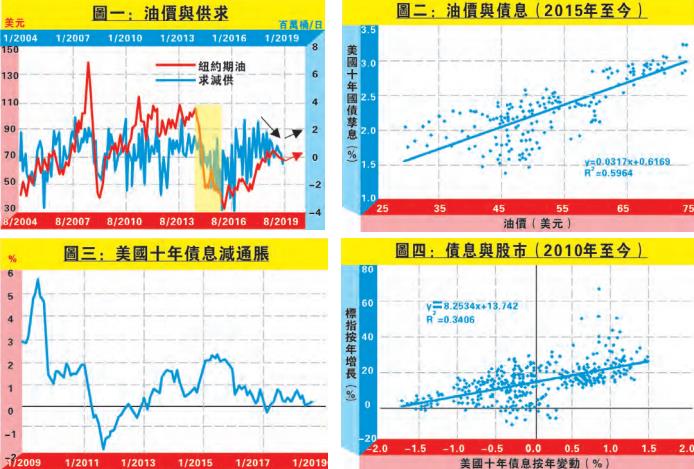 近日市場焦點主要圍繞油價、美國長息及美股,今文將略談這三大資產的去向及相互關係。先看原油市場,最直接由供求入手。美國及加拿大於2014年中開始以水力壓裂技術快速提高了原油產量,形成頁岩油熱潮。按美國能源部的數據可見,市場供過於求的情況嚴重(圖一黃框)。然而,自油組於2017年實行減產協議後,供過於求的情況明顯改善,圖一可見目前更非常接近供求平衡的水平。