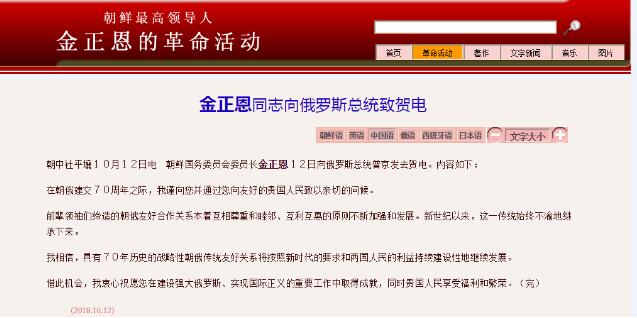 【环球网综合报道记者李慧玲严翔】在朝鲜与俄罗斯建交70周年之际,朝鲜最高领导人金正恩和俄罗斯总统普京互致贺电。朝鲜官方媒体朝中社12日公布了贺电内容。