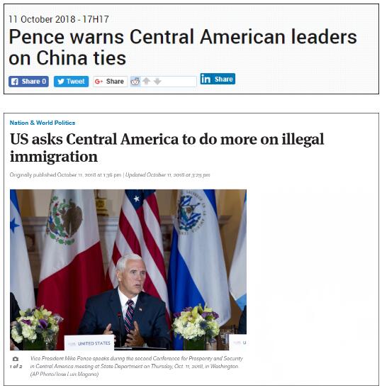 彭斯承认,这些中美洲国家的繁荣程度,对解决非法移民至关重要。之后他竟冷不丁地提到中国,称“如今在中国等国试图扩大在中美洲地区影响力之际,我们认为解决这些问题的最佳途径是,要加强美国和你们,以及西半球所有国家间的联系,以此来增强我们的经济联系”。