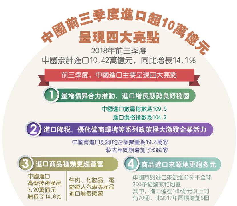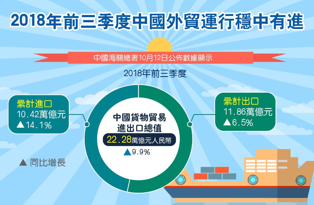 中美貿易摩擦的持續發酵對中國進出口的負面影響似乎尚未顯現,多項外貿數據創新高。海關總署昨日公布數據顯示,今年前三季度中國進出口總值22.28萬億元,同比增9.9%。值得注意的是,據測算,9月單月的進出口數據成為有記錄以來單月貿易額最高的月份,而9月中國對美國貿易順差341.3億美元,較上月擴大30.62億美元,亦創歷史新高。專家認為,近期的人民幣匯率貶值及企業「搶出口」一定程度上影響了9月進出口數據。