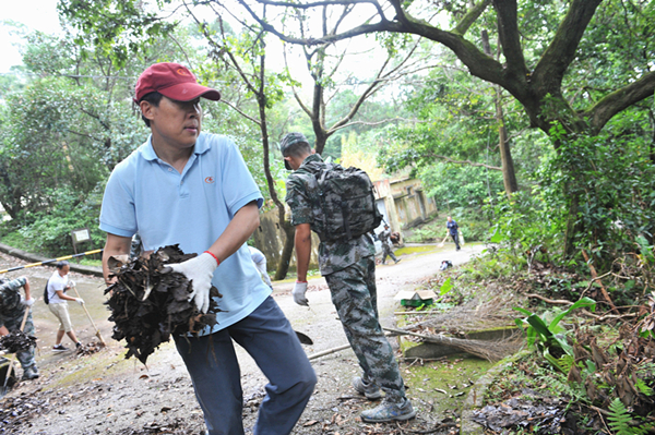 9時許,義工隊伍抵達麥理浩徑。600餘人按照分工計劃,由中聯辦副主任楊建平、外交部駐港特派員公署副特派員楊義瑞、駐港部隊副司令員田永江、香港中國企業協會副會長兼總裁張夏令各率一隊,每支隊伍分若干小組,分別到指定路段展開清理工作。大家全力投入,用鐵鍬、掃把、電鋸等工具清掃道路和台階上的殘枝、樹葉、石頭等雜物,疏通排水溝淤泥堵塞,鋸開路邊倒塌的樹幹並堆放到一處。參與活動的義工們十分投入,人人都汗流浹背,但臉上都洋溢開心的笑容,處處是熱火朝天的義務勞動景象。一處地方清理乾淨了,大家就立即趕往下一個清理現場。餓了累了,就在路邊稍作休息,簡單吃點自帶的乾糧。行山市民路過看到,紛紛向義工隊伍豎大拇指稱讚並表示感謝,有些市民還主動提出和義工們合影留念。