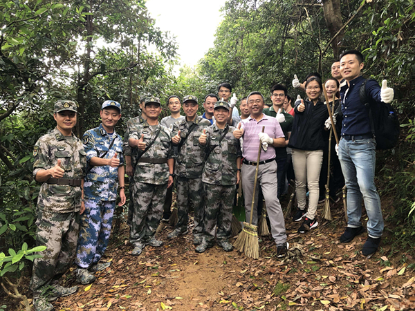 外交部驻港特派员公署部分员工与驻港部队部分官兵在合力完成清理后合影。前排中为驻港部队副司令员田永江少将。