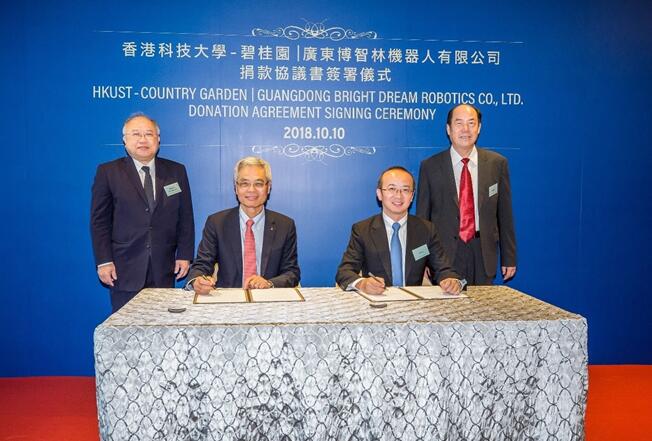 图:香港科技大学校长史维教授(左二)、碧桂园集团副总裁兼广东博智林机器人有限公司总裁沈岗先生(右二)签署捐款协议