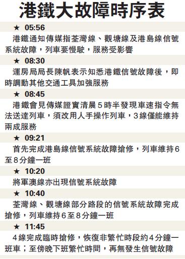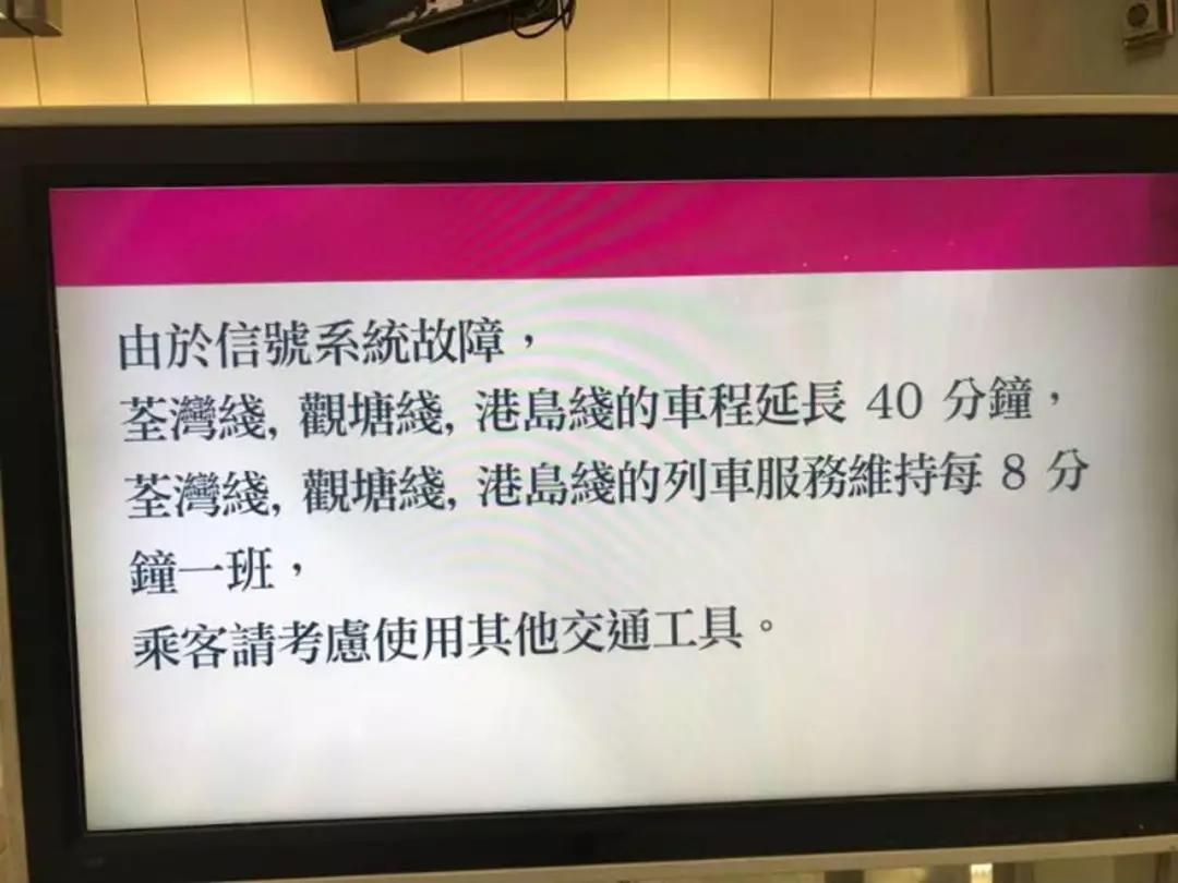 昨日清晨5時許,即在頭班車開出前,港鐵通知傳媒,指荃灣線、觀塘線及港島線因信號系統故障,列車需要慢駛,改由人工操作,服務會受影響,維持12至15分鐘一班車,整體行車時間亦需額外多40分鐘車程,而維修人員也馬上進行搶修。