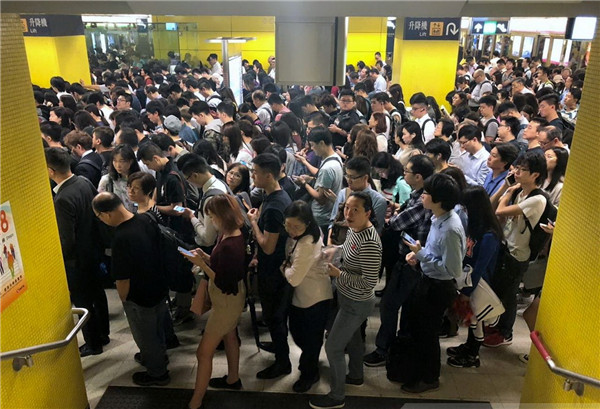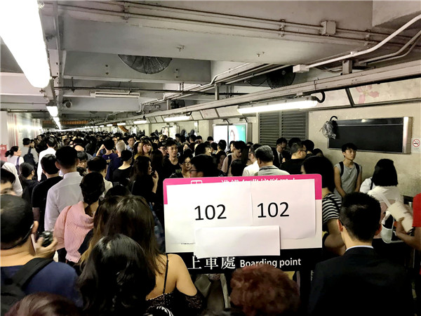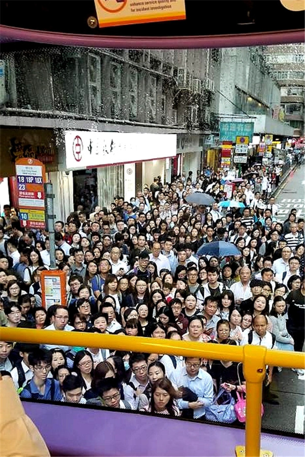 港鐵4條市區主要路線同時發生信號故障後,除了大量上班乘客擠於港鐵站內繼續苦候列車,有不少乘客卻當機立斷「逃離」港鐵站,改乘其他交通工具追趕行程。可是,路面交通如巴士、小巴等,未能消化突如其來的客流量,嚴重超出負荷,令全港各處候車站均出現「迫爆」人潮,候車人龍除了「打蛇餅」外,更要站到馬路中央,萬人擁擠上班情景,重演了早前強颱風「山竹」襲港的災後一幕。