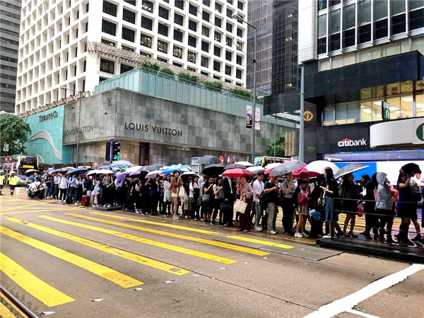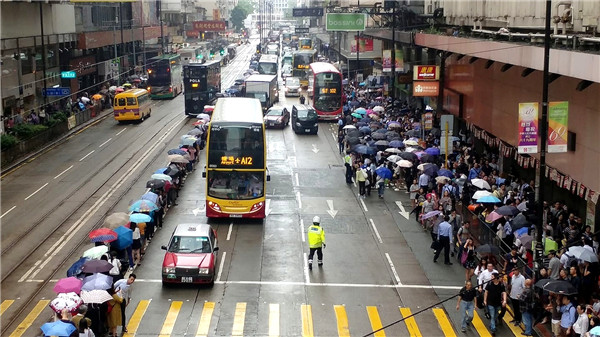 港島區方面,昨晨9時許,港鐵北角站英皇道出口對開近新光戲院有數百人排隊等候巴士和等電車,不少市民候車時出現鼓譟,有車抵站時更紛紛爭先恐後推擠上車,部分更走出馬路,需由警員在場維持秩序。而在電車站位置,逾百人的長龍一字排列在馬路中央,變成來回行車線之間的人牆,由於現場一直下雨,不少人打傘候車,十分狼狽。