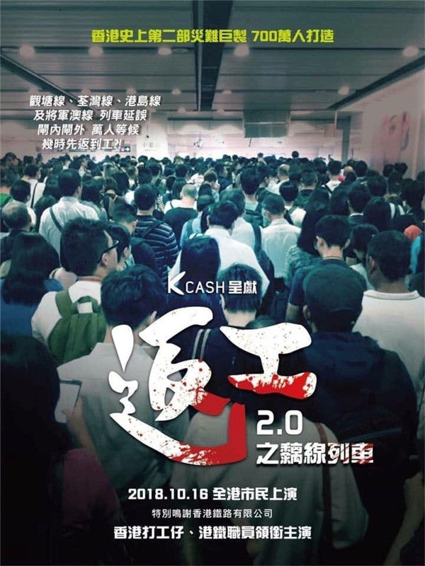 改圖《返工2.0》之「黐線列車」(圖)則以大批市民迫在地鐵趕上班為背景,再配以染血的「返工」大字,暗示港鐵故障,香港人為三餐奔馳趕上班的慘況。韓國喪屍片《屍殺列車》海報亦被改作《香港列車》,以城市發生災難的背景圖比喻港鐵「死機」猶如災難戰爭,附以文字表明「10.16返工返學難我唔到」;至於《返工3》則以英文「Back to work by foot」譏諷行路快過坐地鐵。