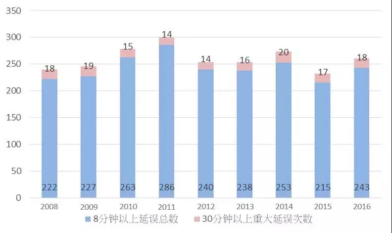 这种“例行式延误”已不是什么新鲜事。以下是2008-2016年港铁8分钟及以上延误次数。