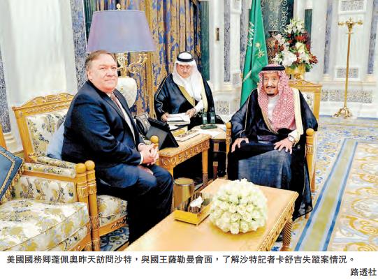 另一位信源稱,報告「非常有可能」得出結論,即審訊在沒有被全部上報並批准的情況下發生,審訊的涉事人員應負責任。另一位信源透露,報告仍在準備中,內容可能會更改。美國國務卿蓬佩奧昨天抵達沙特,隨即會晤國王薩勒曼,了解卡舒吉失蹤的事件。
