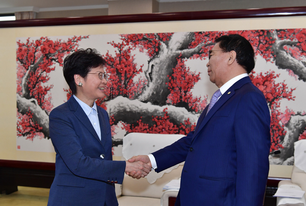 行政長官林鄭月娥(左)今年7月27日在北京與中科院院長白春禮(右)會面。