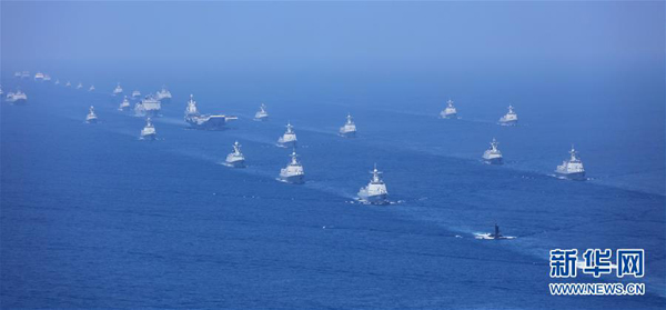 4月12日上午,中央军委在南海海域隆重举行海上阅兵,展示人民海军崭新面貌,激发强国强军坚定信念。中共中央总书记、国家主席、中央军委主席习近平检阅部队并发表重要讲话。这是航母打击作战群等接受检阅。新华社发(莫小亮 摄)