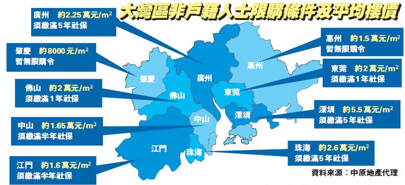 以珠海為例,港人須在當地工作並連續5年繳納社保,才有資格買1套住宅。而在大灣區的九個內地城市中,目前只有惠州和肇慶兩市仍未有全面的限購政策,意味港人毋須在當地工作及繳納社保,也有資格買樓。