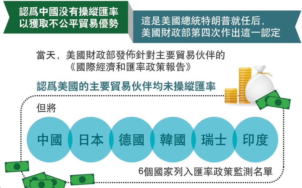 值得注意的是,特朗普曾向美國財政部長鉧欽施壓,要求在匯率報告中將中國列為匯率操縱國。但是,美財政部官員卻找不到證據將中國列為匯率操縱國。鉧欽17日更是明確指出,中國不符合國會制定的匯率操縱國標準。