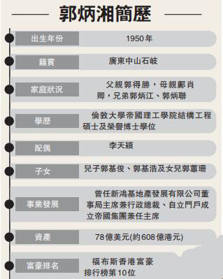 1963年,郭得勝與李兆基、馮景禧合資創辦了新鴻基公司,並擔任董事局主席,打拼幾十年,使郭氏家族成為香港繼李嘉誠之後的第二大富豪家族,身家合共逾2000億港元。郭得勝於1990年因心臟病離世後,李兆基與馮景禧分別創業,新鴻基從此進入「郭氏三兄弟」共同執掌時代,長子郭炳湘出任集團董事局主席兼行政總裁,專注酒店業務;郭炳江及郭炳聯則分別出任副主席兼董事總經理,郭炳江主理建築部、發展部及工程部門,郭炳聯則負責法律及財務部門。三兄弟配合默契,將公司打理得蒸蒸日上,1992年底,新地市值甚至超過了李嘉誠的長實地產。