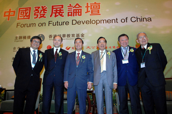 2007年10月12日,由香港培華教育基金舉辦的「中國發展論壇」在廣州南沙舉行。郭炳湘(右二)與嘉賓在論壇上合影。 新華社