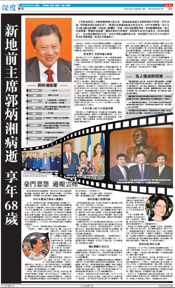 郭炳湘入院後,其三名子女於上月初出任帝國集團董事。公司註冊處資料顯示,郭基俊、郭蕙珊、郭基浩於9月初出任帝國集團及帝國發展的董事,此前郭炳湘是帝國集團及帝國發展的唯一董事。至昨日早上,郭炳湘在港安醫院病逝,享年68歲。有消息指出,郭炳湘並沒有立下遺囑。