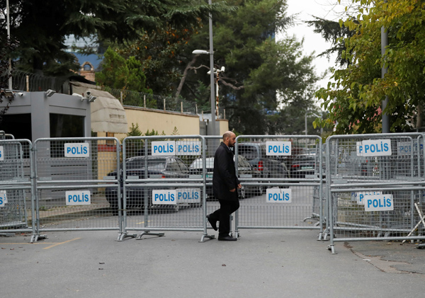 沙特昨日宣布記者卡舒吉已經死亡。圖為沙特駐土耳其領事館附近的路障。新華社