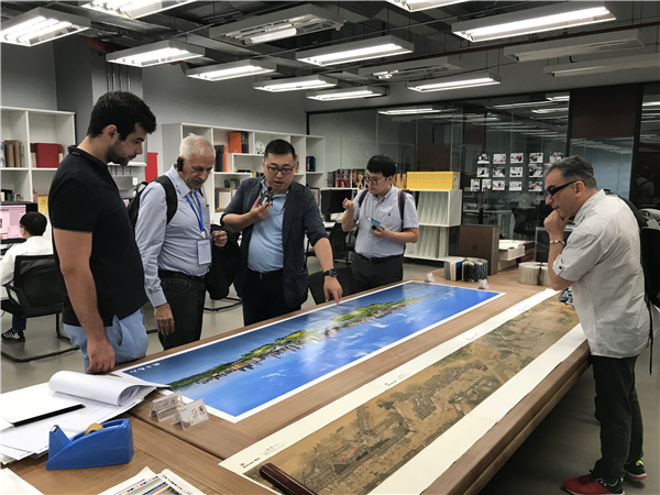在參觀完複製技術以後,記者們來到了色彩管理工作間,在一幅「南山後海總部俯瞰圖」前,李國哲用英文講解色彩管理關鍵之處。隨後記者們隔着窗戶觀看製作工作間。AtulAneja在參觀時特別留意到雅昌擁有全球最大藝術家數據庫,內含94000人。據介紹,這個數據庫的建立,與藝術家聯系出書有關,李國哲表示,外媒通過登錄雅昌藝術網可查詢到這些藝術家的資料。據了解,除深圳以外,雅昌在北京、上海均有分部,全球僅報道藝術活動的媒體記者就達到300多位。
