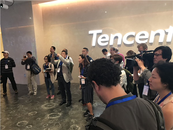 位於南山區濱海大道一側的騰訊濱海大廈,遠遠地就以其新奇的外觀吸引到記者。在等待進入大廈前,記者們首先參觀其周邊產品主題店,他們就被這裏時尚、年輕的環境所吸引。走進大廈,記者們來到了其最新的展廳,展廳門外顯示,微信活躍用戶數105800萬。進入展廳映入眼簾的是機房模型,據介紹,騰訊的伺服器安放在貴州山洞裏,可抗核打擊。隨後幾個視頻短片,讓人直觀感受騰訊在民生以及社會各個層面中方方面面的應用。
