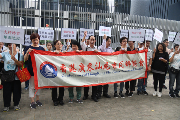 香港廣東汕尾市同鄉總會的會友在抵達政府總部後拉舉起橫額,並高聲讀出訴求。他們稱堅決支持「明日大嶼」計劃,支持特首填海造屋,堅決反對地產霸權,並表示民生第一大事,先要解決住屋需求,而本港住屋問題已是迫在眉睫,房屋問題一日不解決,香港也沒前景,建議政府速建公屋以改善民生,惟他們明白徵地有困難,相信填海會是最理想選擇。