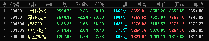 截止收盘,上证综指盘中失守2600点,跌2.26%,报2594.83点;深证成指跌2.24%,报7574.99点;创业板指跌1.74%,报1292.06点,中小板指跌幅达到2.84%,较盘中最大跌幅有所收窄。