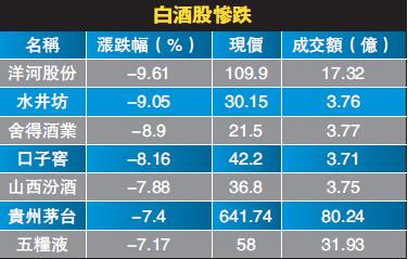 【香港商報网訊】周一的放量反彈未能延續,昨日A股主要股指全面回調。上證綜指失守2600點整數位,和深證成指同步錄得2%以上的跌幅。白酒板塊在昨日早盤特別顯眼,成為跌勢最猛的一個,截至午盤收盤整體跌幅高達逾6%,遠超跌幅第二的食品指數的跌2.49%。一線白酒「貴、五、瀘」暴跌超7%,貴州茅台盤中更是一度跌超8%。