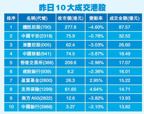 港股5大重磅股齊跌,騰訊(700)曾挫近半成,收報277.8元,跌4.6%;友邦保險(1299)挫4.6%;汇豐控股(005)跌3%,再創52周低位;中移動(941)業績遜預期,收跌3.8%;收市後公布季績的建設銀行(939)跌2.3%。澳門政府擬重新競投賭牌,濠賭股沽壓重。銀河娛樂收挫7.9%,是表現最差藍籌;金沙中國跌5.2%;永利澳門跌5.8%。內房股沽壓亦大,主要大型內房股普遍跌3%至6%。工信部指汽車市場難見高增長,北京汽車(1958)挫9%,其他汽車股亦普跌3%至6%。