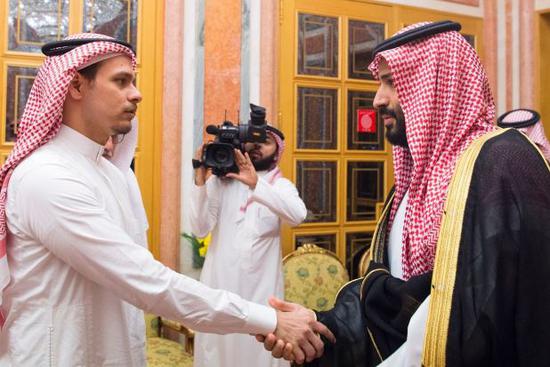 ▲沙特王储于23日下午会见卡舒吉之子 (左)。图据社交媒体