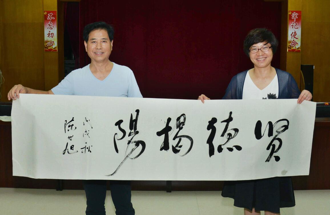 采风团团长陈世旭给揭阳市题写墨宝《贤德揭阳》。右一为中共揭阳市委常委宣传部部长方赛妹