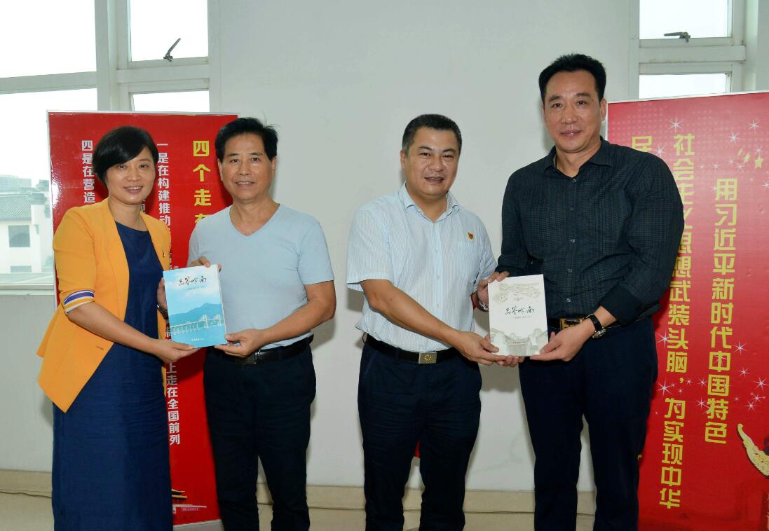 采访团向揭东区赠送《品鉴岭南》从左至右为中共揭东区委常委宣传部长林晓珊、采风团陈世旭主席、中共揭东区委书记方烽、香港商报广东分社副社长兰钧然.
