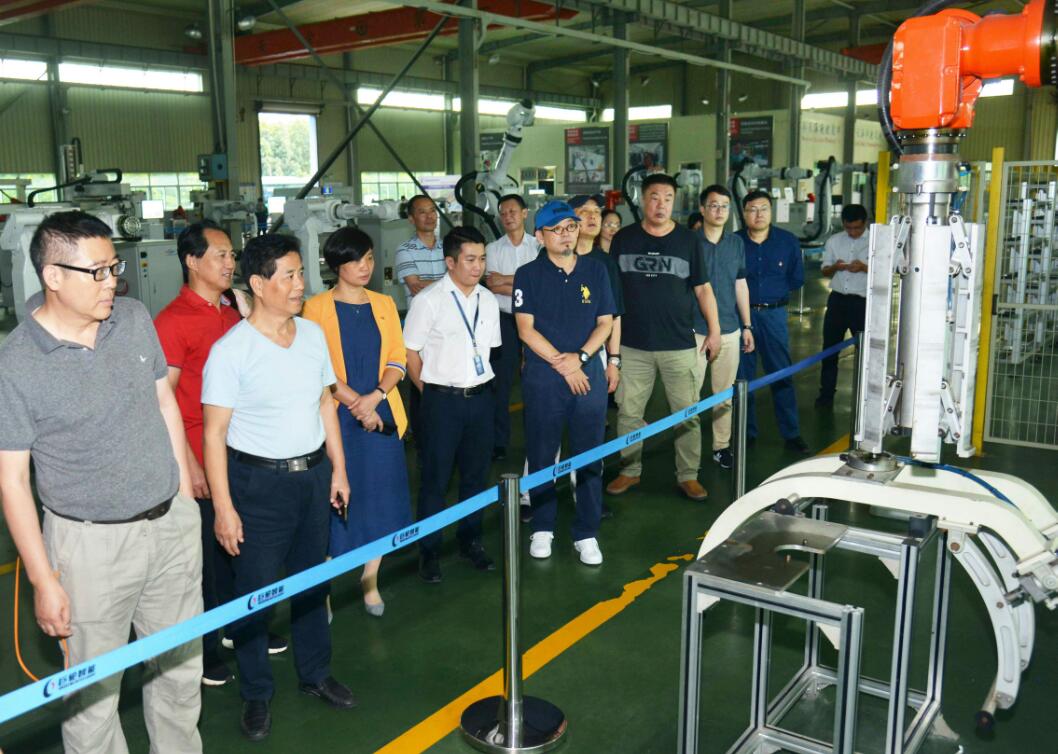 采风团作家们在巨轮智能装备股份有限公司观看机器人手臂表演。