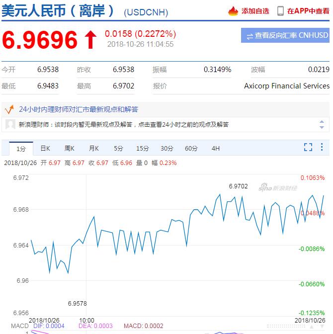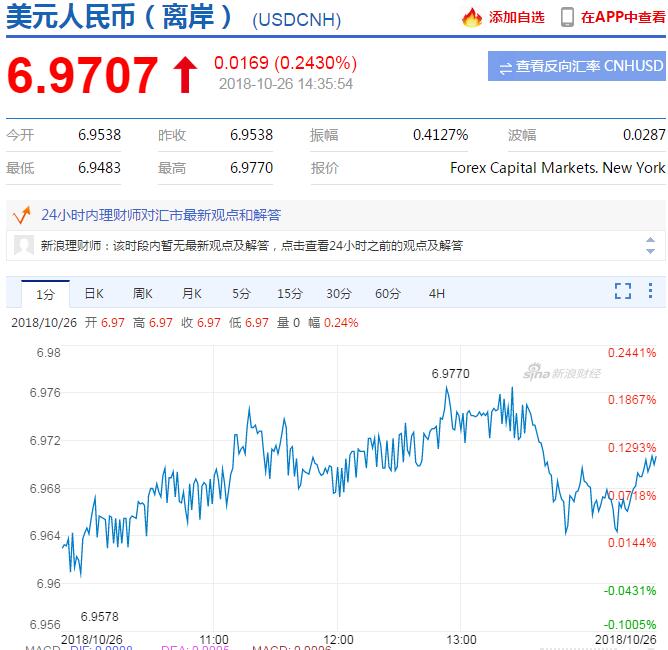 昨日,人民幣對美元匯價進一步走低,離岸失守6.96心理關口,在岸跌破6.95,均刷新去年1月以來最低水平。今天一早,离岸人民币更是跌破6.97关口,之后更是继续下探,一度跌至6.977,之后在6.97关口拉锯,人民幣匯率與「7」關口僅在咫尺之遙。