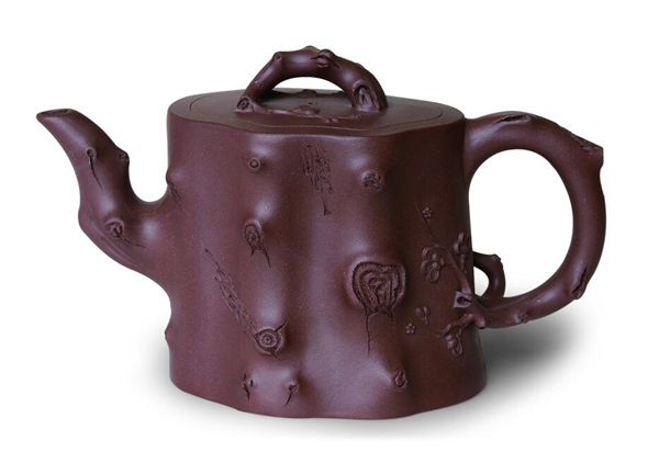《树桩》——在古拙的树桩中追求艺术的新意,张瑞端可谓深谙中国古代哲学和美学的辩证精髓。作品以不腐的泥土去表现特殊的艺术对象,让人感受到一种亲切的恒久魅力,并对艺术所赋予的生命力充满了无限的向往,也叫人深刻地理解到苏东坡“绚烂至极,归于平淡”的高远境界。此壶造型苍劲雄浑,刻工利落稳健;壶钮造型新颖、颇具新意;壶嘴舒出自然、比例适度;壶流虚实有度、挺括有力;壶把下方的几朵不起眼的梅花,在生命的低处孕育着无穷的希望,就像是身边一汪清澈的泉水,浸泡着一个个值得缅怀的黄昏……
