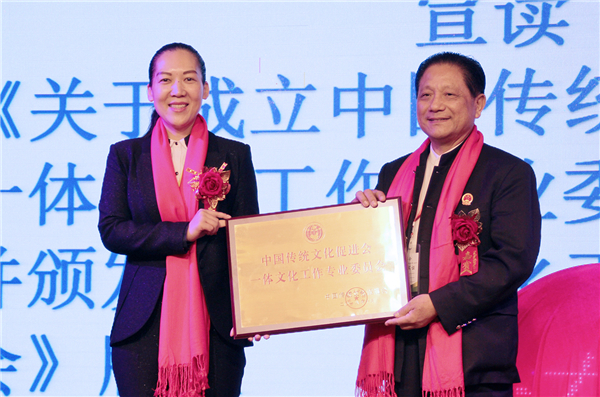 中国传统文化促进会名誉会长李土生(右)为一体文化工作专业委员会颁发牌匾。