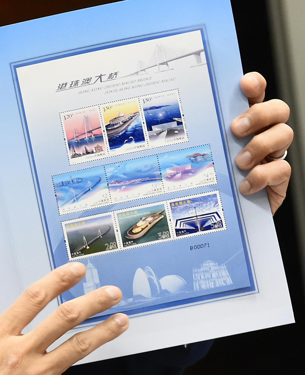 此外,香港邮政昨午举行发布会介绍港珠澳大桥的香港纪念邮票及相关纪念品。香港的一套4枚邮票以港珠澳大桥的中英文名称为设计重点,邮票分别印上代表香港的H和「港」字(2元)、代表珠海的Z和「珠」字(3.7元)、代表澳门的M和「澳」字(4.9元),以及表达「大桥」之意的B和「桥」字(5元)。字母和文字与背景的格线图案交织成细致网络,象征公路网络紧密连贯,促进粤港澳大湾区内各地融合。