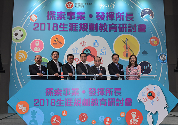 政務司司長張建宗(右三)、教育局局長楊潤雄(右四)、深圳市教育局副局長趙立(右二)及其他嘉賓主持「探索事業‧發揮所長——2018生涯規劃教育研討會」開幕儀式。