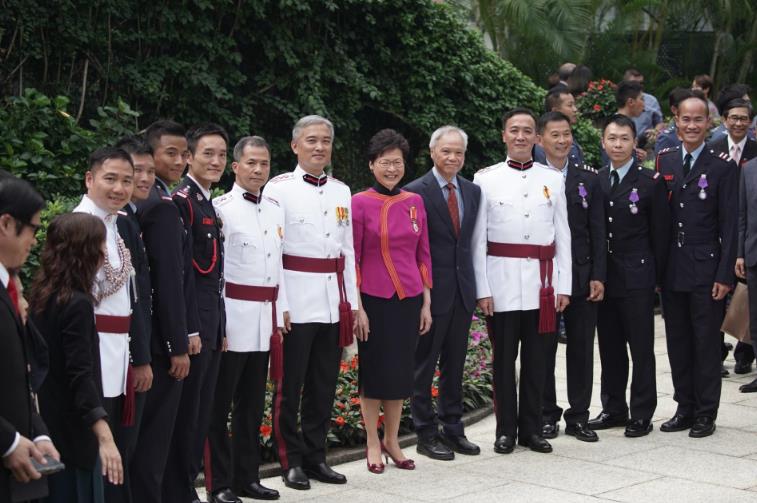 多名飛行服務隊成員(上圖)和消防員(下圖),在去年熱帶氣旋「天鴿」和「帕卡」襲港期間救人,獲頒銀英勇勳章或銅英勇勳章。圖為行政長官林鄭月娥與得獎者合影。