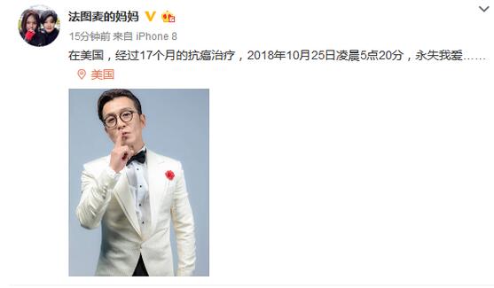 李咏妻子@法图麦的妈妈 发文:在美国,经过17个月的抗癌治疗,2018年10月25日凌晨5点20分,永失我爱……