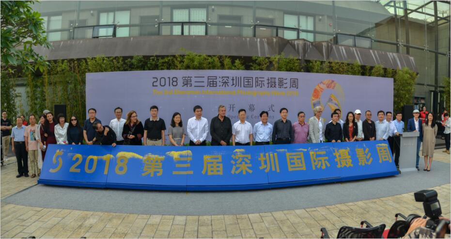 摄影周开幕式现场,原深圳市常务副市长刘应力,深圳市委宣传部常务副部长陈金海,深圳市文联党组书记、主席李瑞琦,深圳市文体旅游局副局长钱强,深圳市文联党组成员、副主席梁宇,罗湖区委常委、宣传部长王萍,中国摄影家协会顾问张桐胜,广东省摄影家协会主席李洁军,法兰西艺术院院士、法国摄影家布鲁诺·巴贝,法国摄影家埃里克·布雷特、玛丽·保勒·奈格等领导及嘉宾出席了开幕式。策展人孙成毅和中国摄影家协会顾问张桐胜分别上台作了致辞。在庄重而热烈的氛围中,领导及嘉宾上台参与启动仪式。随着鎏金沙的倾倒,“2018第三届深圳国际摄影周”的字样浮现,深圳市委宣传部常务副部长陈金海宣布开幕,整个会场掌声四起,欢声雷动,将整个开幕式活动推向高潮。在集体合影留念后,展览参观正式开始。