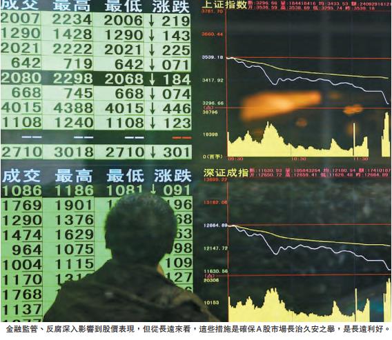 應該看到,無論是加強金融監管還是推進金融反腐的深入,雖然暫時令部分上市公司受到波及,同時,部分違法資金也因受到查處而撤離股市,影響到股價表現,但從長遠來看,這些措施是確保A股市場長治久安之舉,是長遠利好。