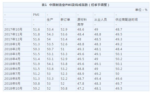 2018年10月份,中国制造业采购经理指数(PMI)为50.2%,比上月回落0.6个百分点,制造业总体继续运行在扩张区间,但扩张速度放缓。