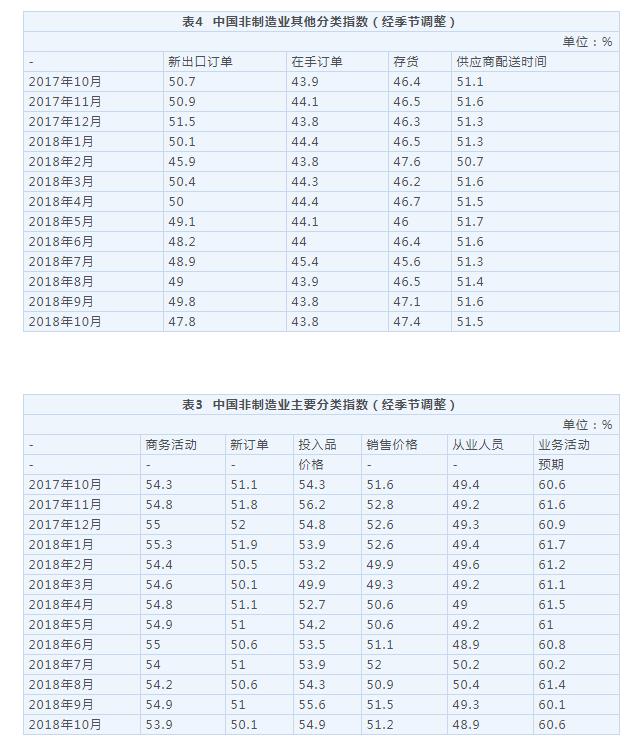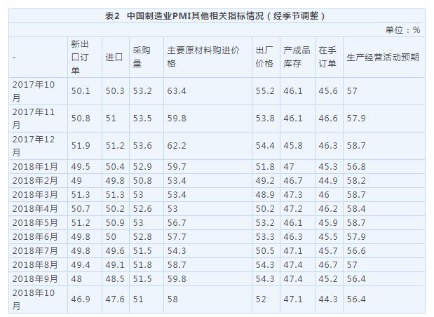 10月份,受“十一”长假和外部环境复杂多变等因素影响,制造业供需出现一些波动,制造业PMI为50.2%,环比回落0.6个百分点,但仍位于扩张区间,制造业总体继续保持增长,增速放缓。本月主要特点:一是制造业基本面总体平稳。在调查的21个行业中,13个行业的PMI位于扩张区间,其中农副食品加工、食品及酒饮料精制茶、纺织服装服饰、医药等制造业PMI均位于53.0%以上较高运行水平,增速较快;纺织业和汽车制造业等行业PMI位于收缩区间,同比、环比均有所回落。二是供需稳中有缓。生产指数为52.0%,比上月回落1.0个百分点。新订单指数为50.8%,比上月回落1.2个百分点,其中反映外部需求变化的新出口订单指数为46.9%,低于上月1.1个百分点。三是价格指数有所回调。主要原材料购进价格指数和出厂价格指数为58.0%和52.0%,分别比上月回落1.8和2.3个百分点,价格上涨压力有所缓解。但调查结果也反映出,主要原材料购进价格指数和出厂价格指数差值扩大到6.0个百分点,表明制造业原材料采购价格涨幅继续超过产品出厂价格,影响了部分企业的效益增长。四是企业对未来三个月生产经营预期基本稳定。生产经营活动预期指数为56.4%,与上月持平。在调查的21个行业大类中,除纺织业外,均高于临界点。其中,农副食品加工、食品及酒饮料精制茶、专用设备、铁路船舶航空航天设备等制造业位于60.0%以上的高位景气区间,且环比均有所提升。