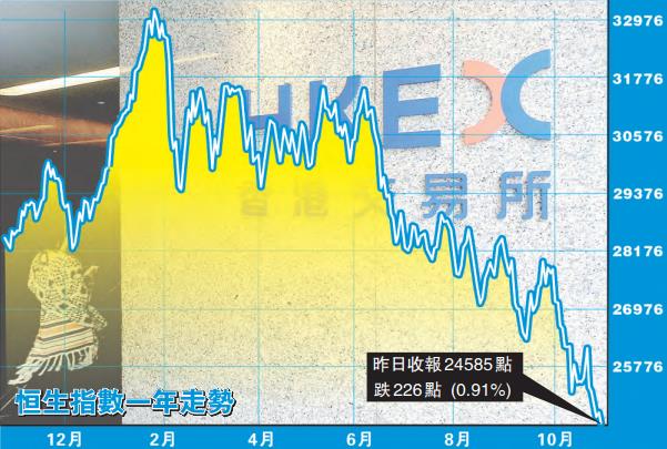 上周五港股弱勢未改,一度瀉逾400點見24589點,創近18個月低位,最終全日跌276點收24717點。