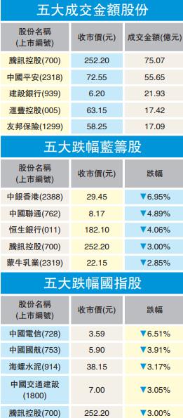 英國擬將開徵新的「數碼服務稅」矛頭直指一眾互聯網巨頭,美國科網股急挫,加上中美貿易戰有擴大危機,隔夜美股走勢反覆向下,美國科技股急挫。騰訊(700)昨跌至251.4元的近1年半低位,收市報252.2元,跌3%,拖低恒指65點。小米集團(1810)曾跌至11.4元上市新低,收報11.66元,跌3%;美團點評(3690)一度跌穿50元,創49.8元上市新低,收報50.15元,跌5.1%。傳中國計劃將車輛購置稅減半,汽車股反彈,長城汽車(2333)飆7.3%;廣汽集團(2238)升4.3%。