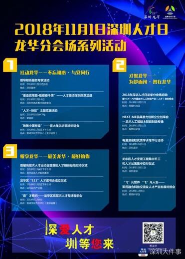 11月深圳读书月期间,龙华区将集中开展龙华人才媒体宣传活动,集中报道龙华园区、各部门人才引进、使用和培养等先进经验,全面展示龙华区人才工作成绩和人才风采。并在全区各党群服务中心、人才服务站、人才驿站开展为期一个月的巡展,积极宣传推广龙华人才政策,实现人才工作的全域覆盖。