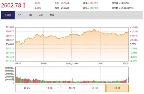 10月的最后一个交易日,沪深两市股指小幅高开,随后沪指盘中重返2600点上方,深成指及创指盘中一度涨超2%,临近尾盘,三大股指经过短暂整理后再度小幅拉升,两市成交量明显放大,沪市成交1549亿元,深市成交1600亿元。截至收盘,沪指报2602.78点,涨幅1.35%;深成指报7482.83点,涨幅1.46%;中小板指报4999.83点,涨幅1.54%;创业板指报1275.57点,涨幅1.24%。