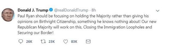 对于瑞恩的表态,特朗普当地时间周三在推特上回应称:“保罗? 瑞恩应该把心思放在守住众议院多数,而不是对于‘出生公民权’发表意见。他对这件事儿啥也不懂!如果共和党守住众议院多数, 我们将在解决移民问题和保护边境上继续推进!”
